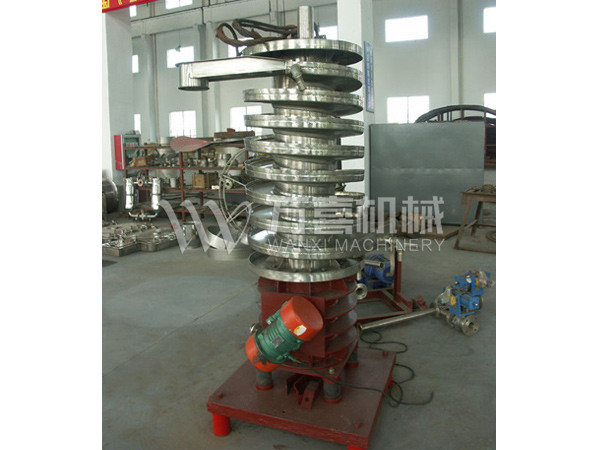 濕物料自頂部加料口進入螺旋床內,在周向激振力及重力的作用下,物料沿螺旋床自上而下作跳躍運動直至最底層;同時,潔凈的熱風由螺旋床底部進入,與分布在床上的物料進行充分的傳熱和傳質后,由頂部排濕口排出。從而使物料達到了干燥的目的。