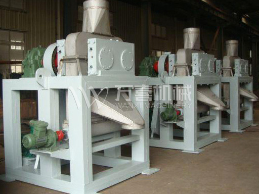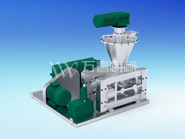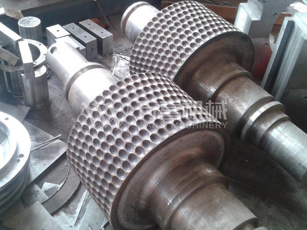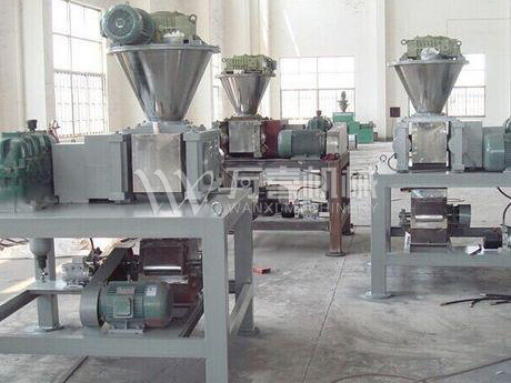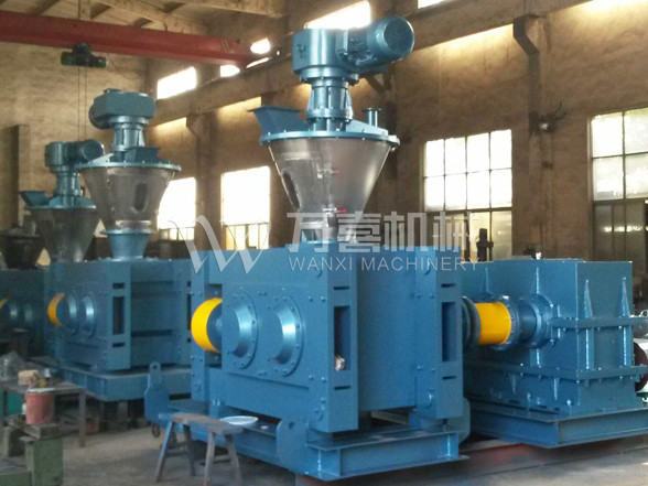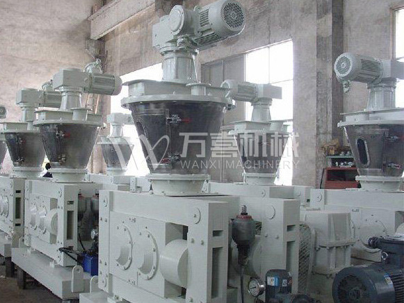 擠壓造粒的形式可以有對(duì)輥式和輪輾式兩種,對(duì)輥式擠壓是先壓成大塊,再破碎成顆粒,這樣裝置的能力大、顆粒強(qiáng)度高、能耗低,對(duì)輥擠壓在國(guó)外使用廣泛。輪輾式是在輥表面直接做成有穴槽型的形狀,一次擠成成型顆粒。產(chǎn)品強(qiáng)度較低有時(shí)需添加粘結(jié)劑。適合做有機(jī)肥和復(fù)合肥等顆粒肥料。